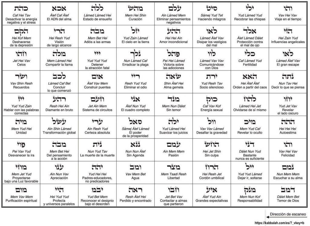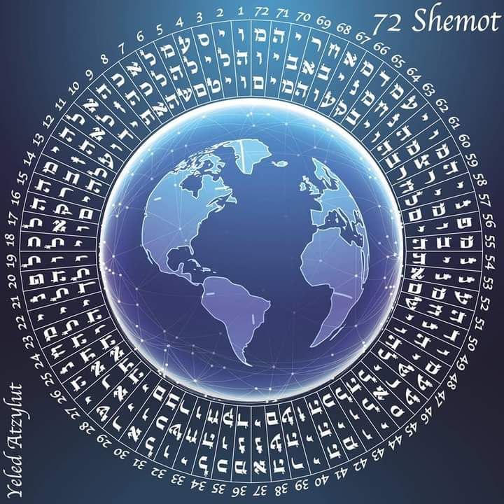 Según la Cabalá, en la historia bíblica del Mar Rojo, los nombres estaban codificados y escondidos allí (se encuentra en el libro de Éxodo, capítulo 14). Tres versos cuentan esta historia – 19, 20 y 21 – y cada verso contiene 72 letras que a su vez se emparejan en 3 letras, presentando así el nombre de un ángel expresando el poder/atributo respectivo de Dios.